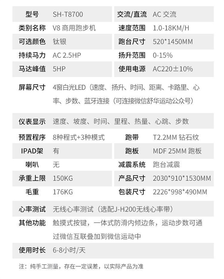 舒华商用跑步机SH-T860(V6)采用商用大跑台,手握心律测试,全跑台减震护足的设计,对您跑步中的膝盖进行全方位的呵护,选用手握式感应片测心率等数据,跑步面积达580×1570mm,可承受180kg的使用者使用。