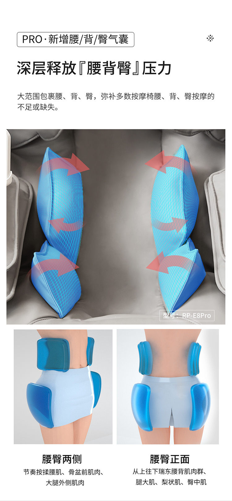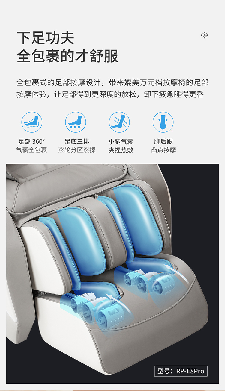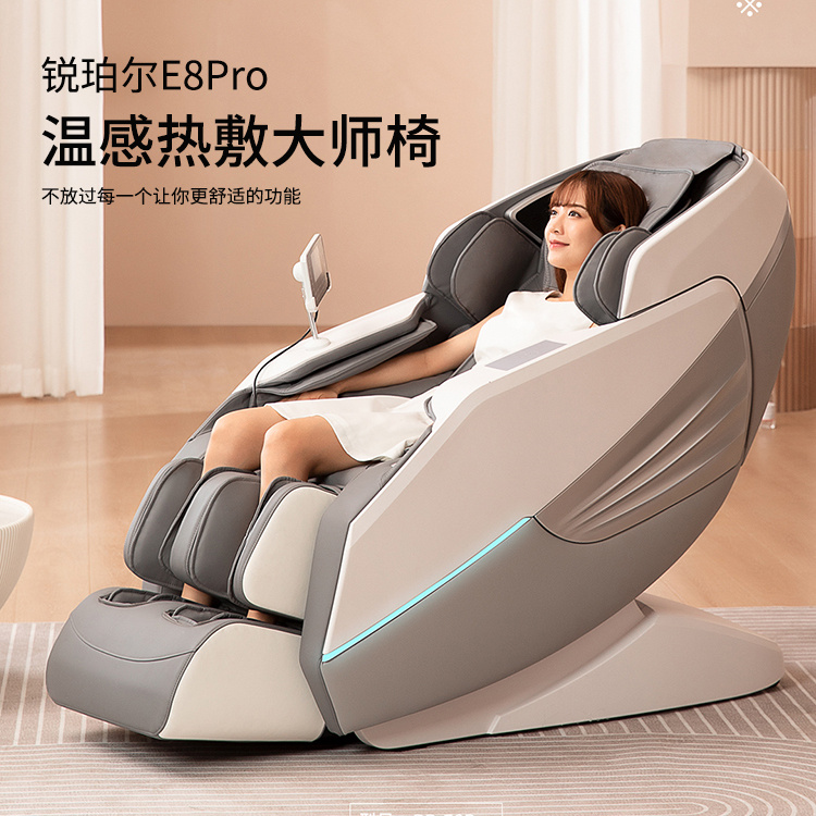 • 产品简介:锐珀尔新品按摩椅E8 Pro拥有温感养生系统,3D摆揉机械手,十大按摩手法,138cm超长SL按摩导轨,腿足一体按摩等功能,并且有无线充的一款新品按摩椅,价格不贵,重在享受。
